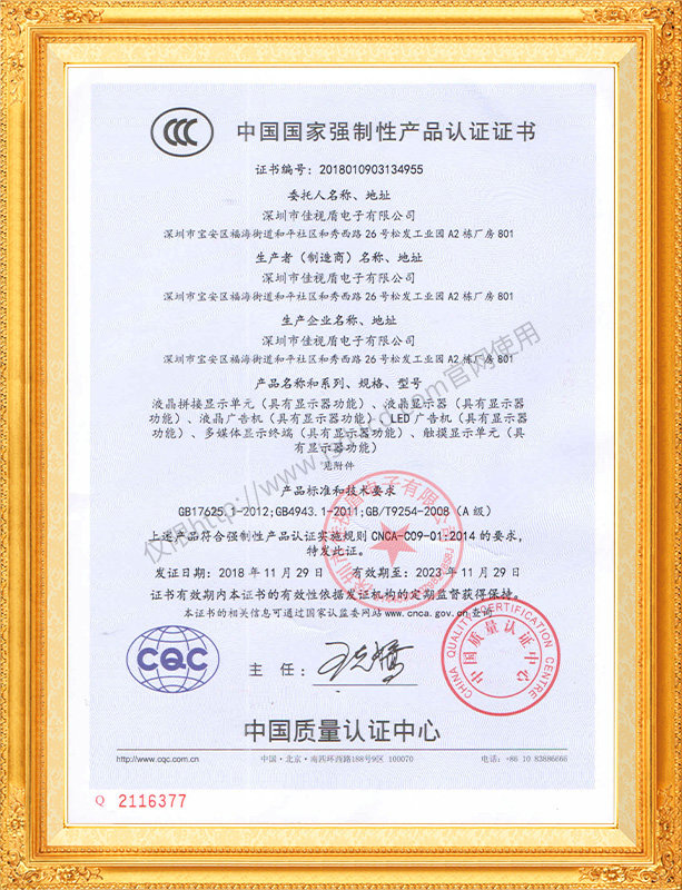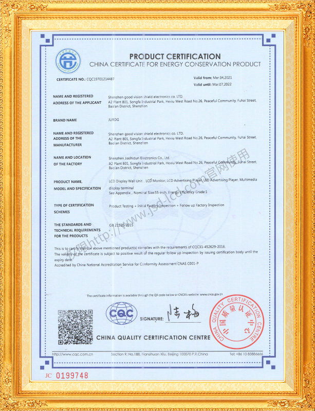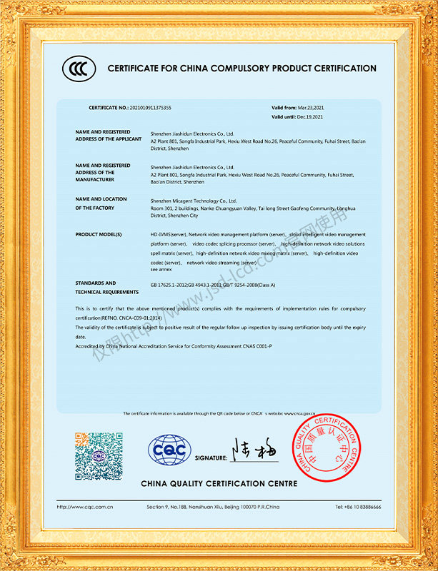 佳視盾科技采用了科學現代化管理模式,公司和產品通過了CCC、CB、CE、FCC、ROHS、ISO9001、職業健康管理體系、環境管理體系,中國節能認證、多項認證,取得多項專利技術及多項軟件著作權, 并獲得國家及行業協會的多項榮譽證書,所有產品均經過嚴格老化檢測及測試,達到行業優等品的出貨標準。